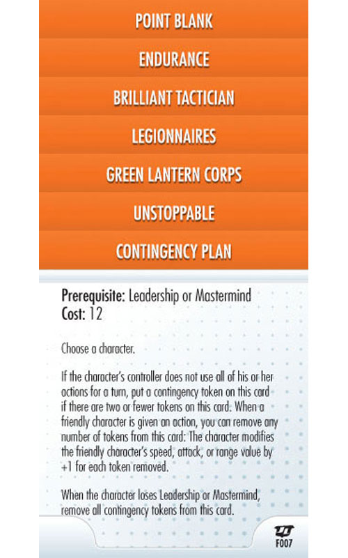 #F001 – Point Blank, #F002 – Endurance, #F003 – Brilliant Tactician, #F004 – Legionnaires, #F005 – Green Lantern Corps, #F006 – Unstoppable, #F007 – Contingency Plan